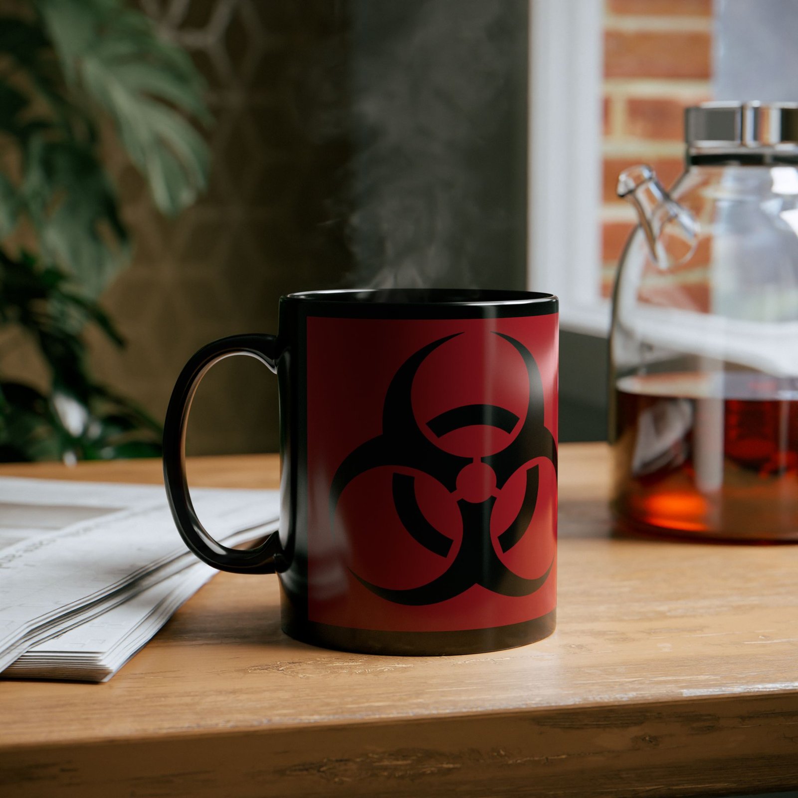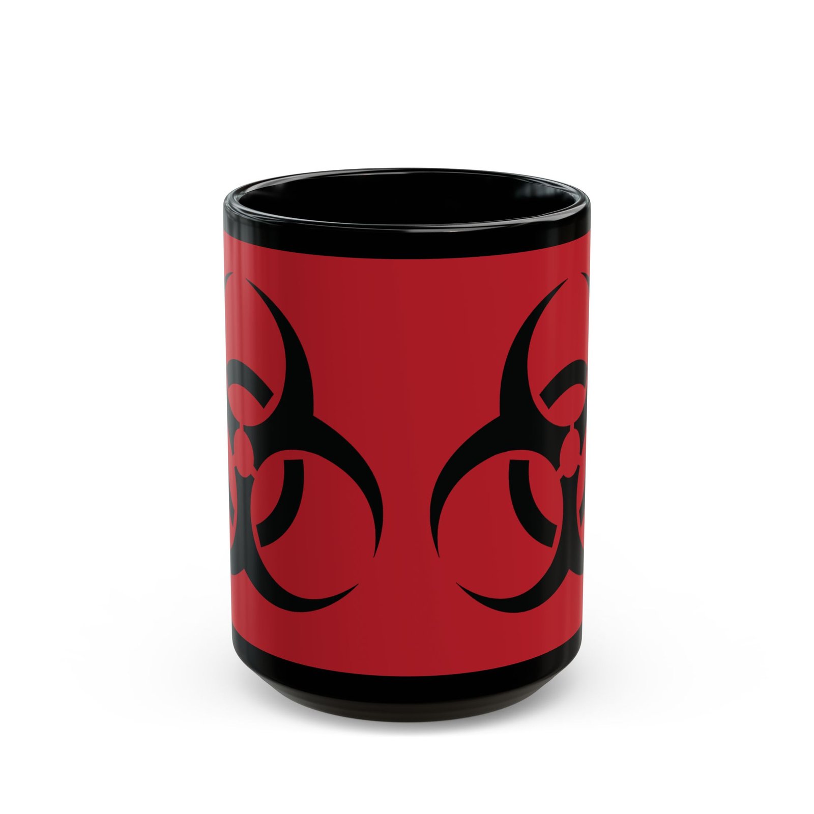 ☕ Toxic Style – The bold biohazard symbol pops against the black background, giving off serious apocalyptic vibes.
