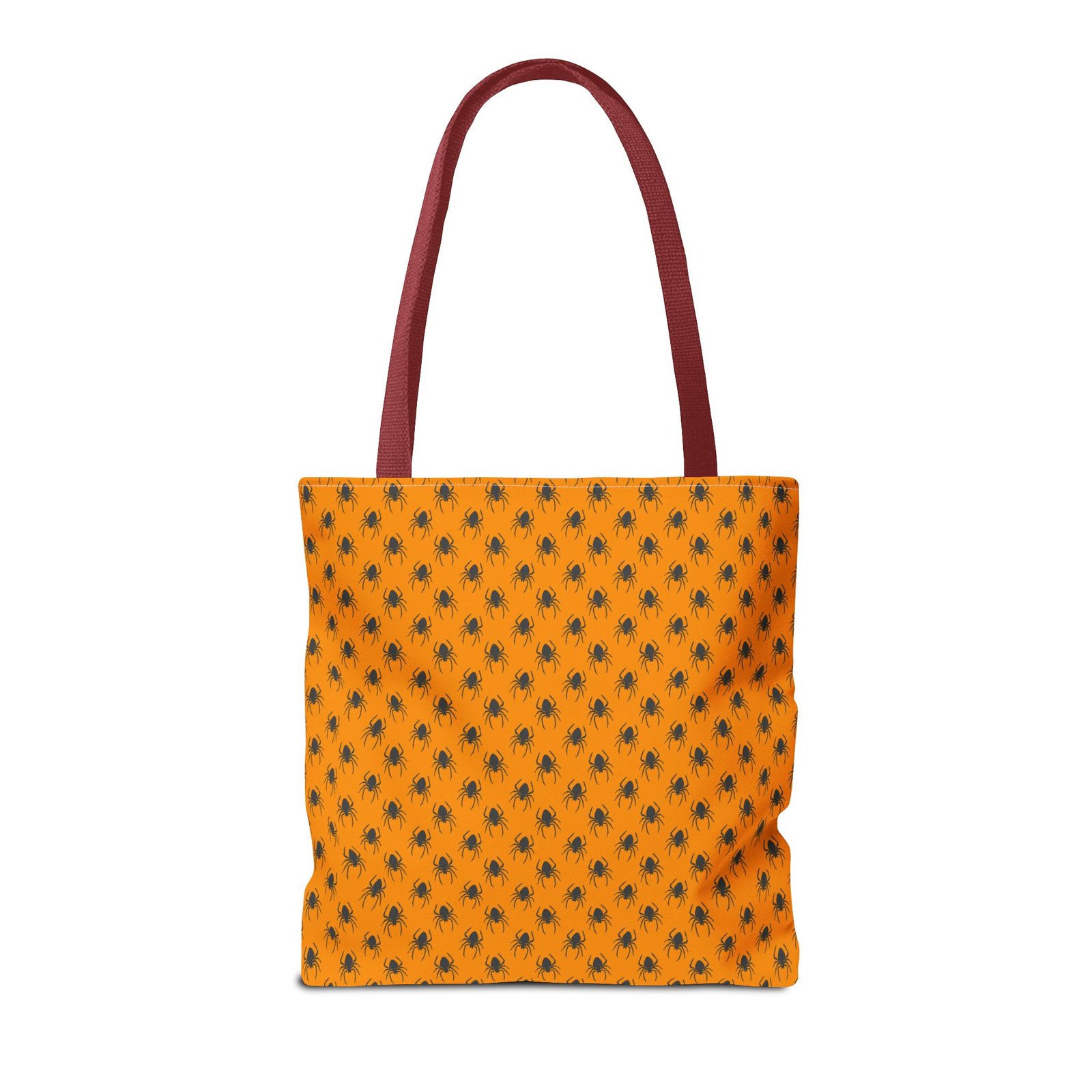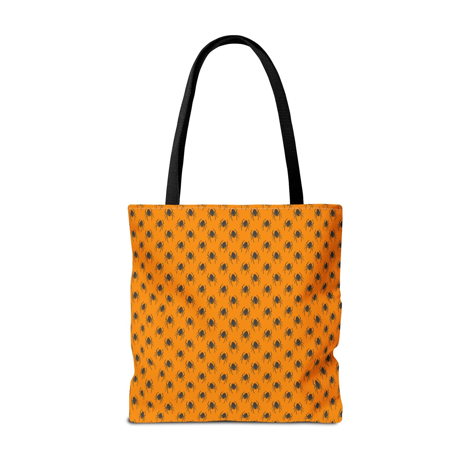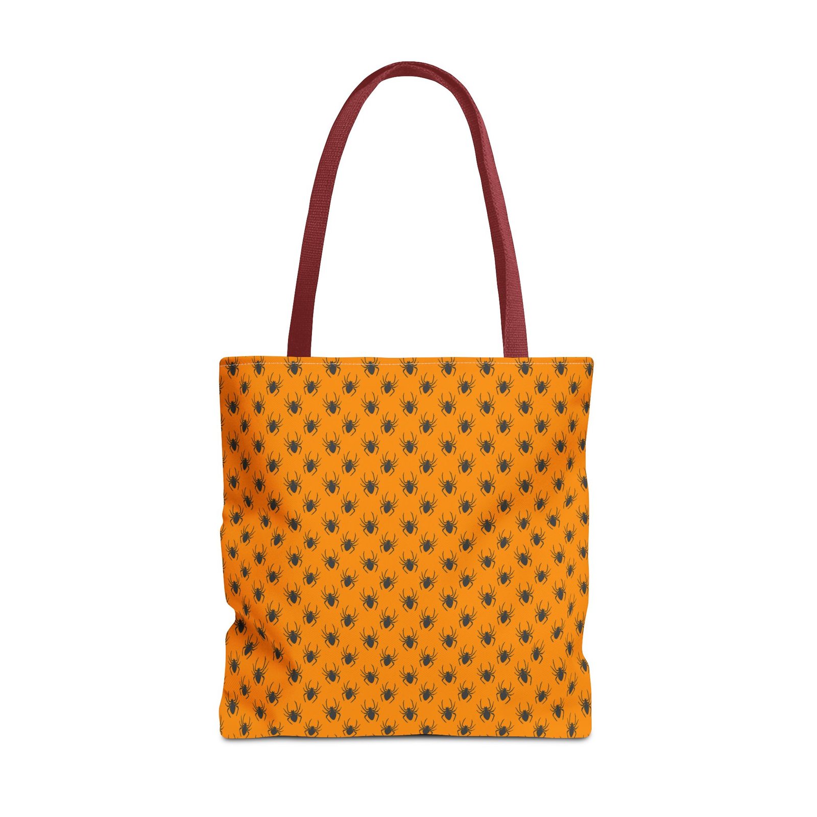 Tags: spider tote bag, halloween tote, black spider pattern bag, orange halloween tote, spooky tote bag, gothic spider accessory, halloween candy tote, creepy crawly bag, spider print tote, black portal merch