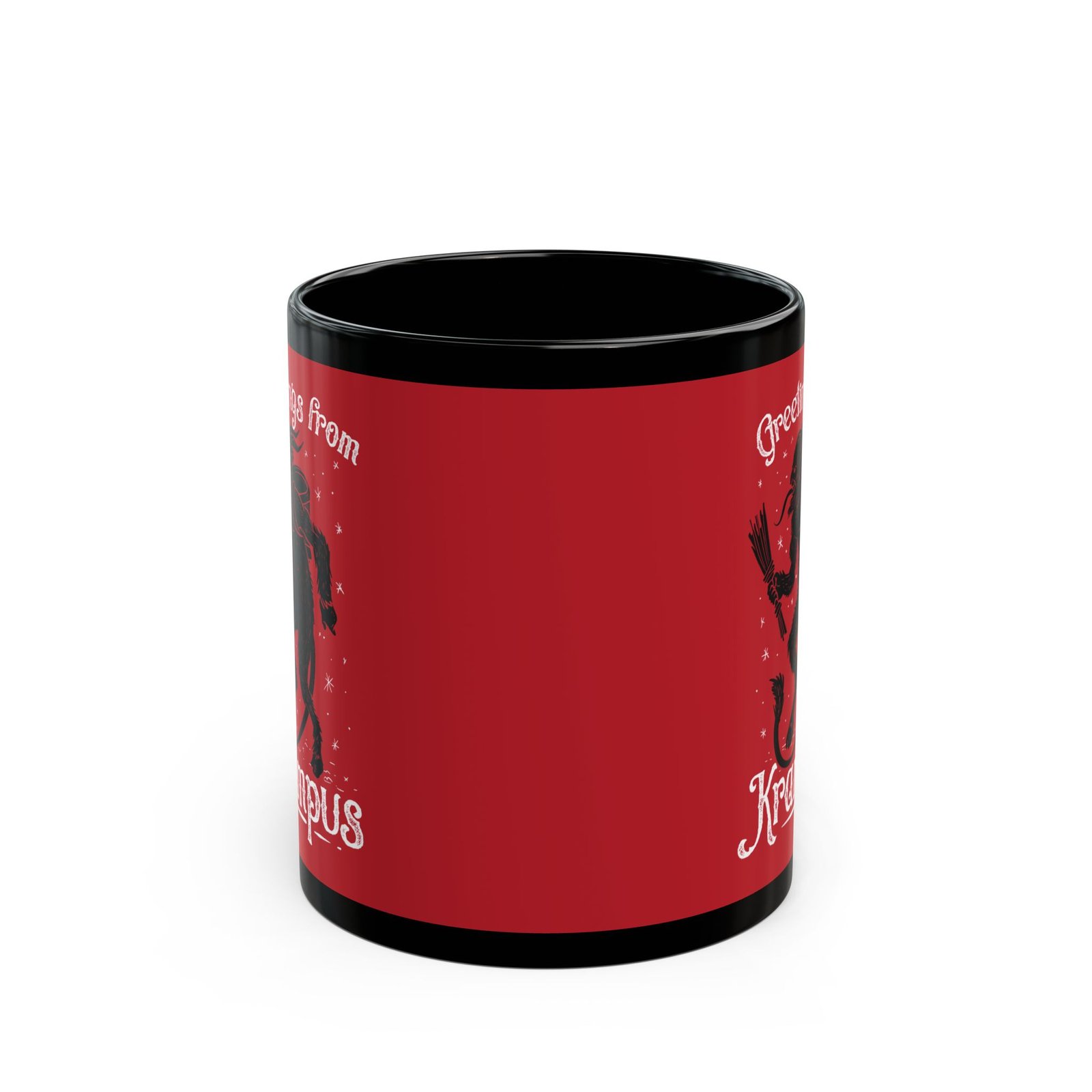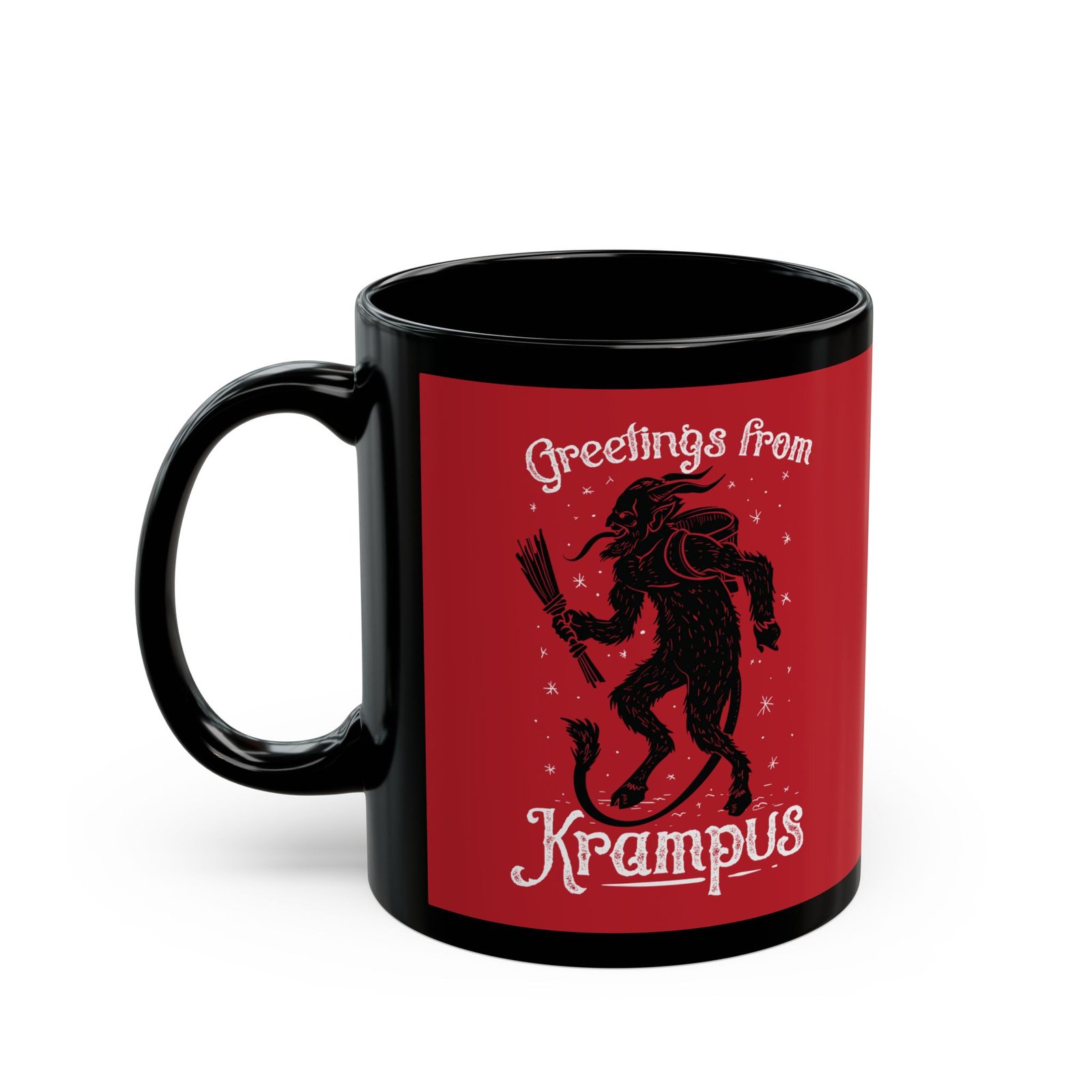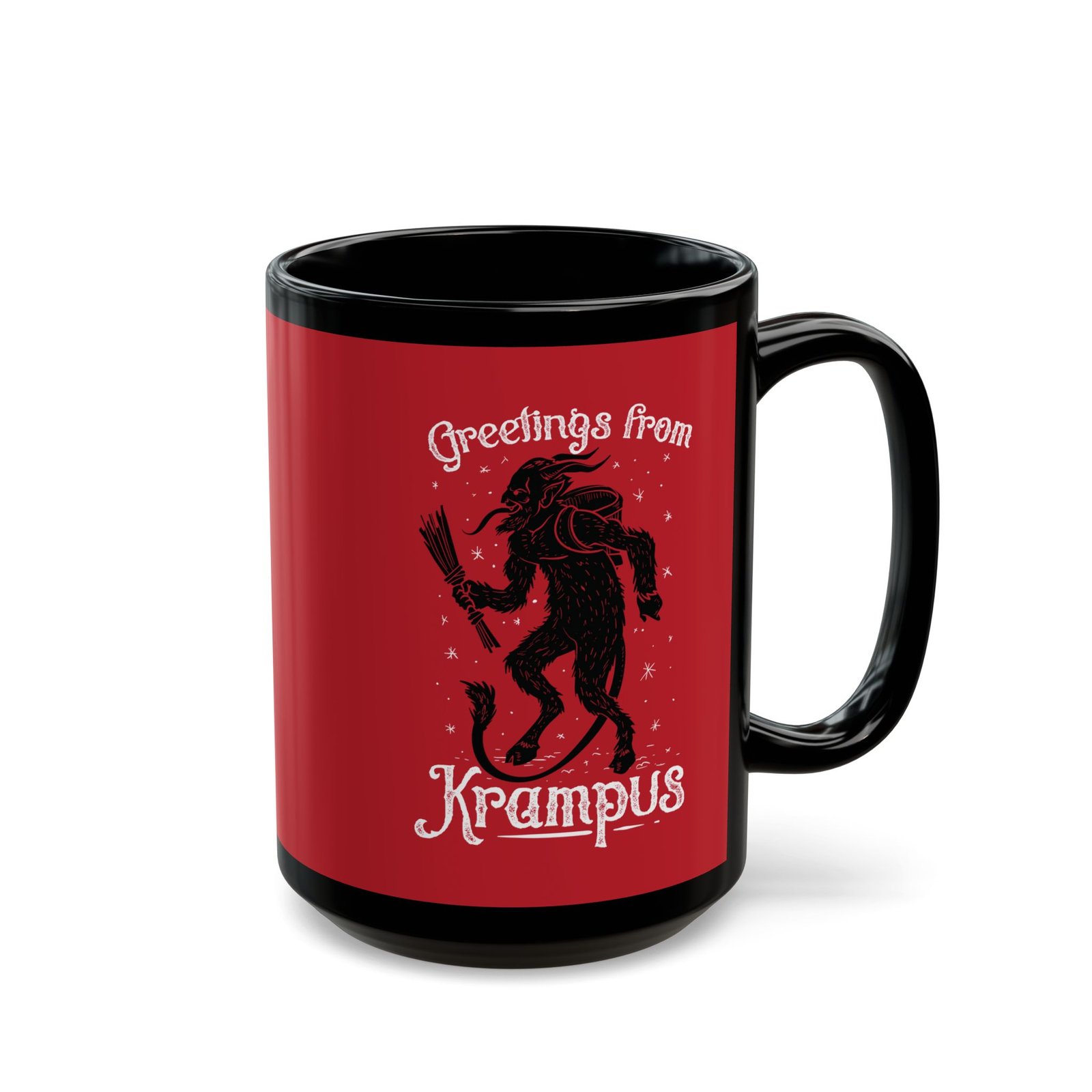 Add a wicked twist to your holiday sips with this Greetings From Krampus black ceramic mug! Featuring a striking image of Krampus and vintage-inspired festive lettering, this 11 or 15 oz mug is perfect for those who prefer creepy over cozy and coal over cookies.