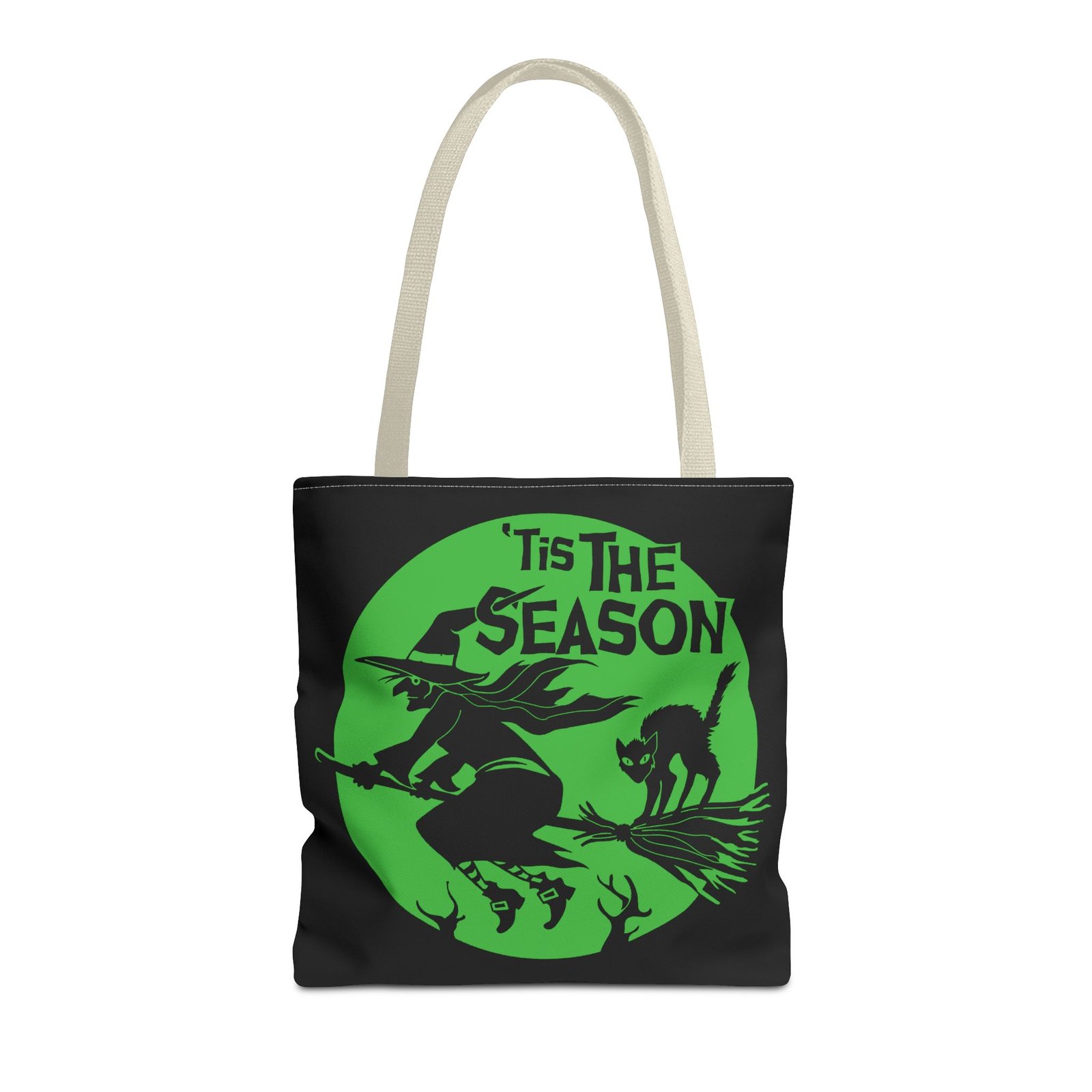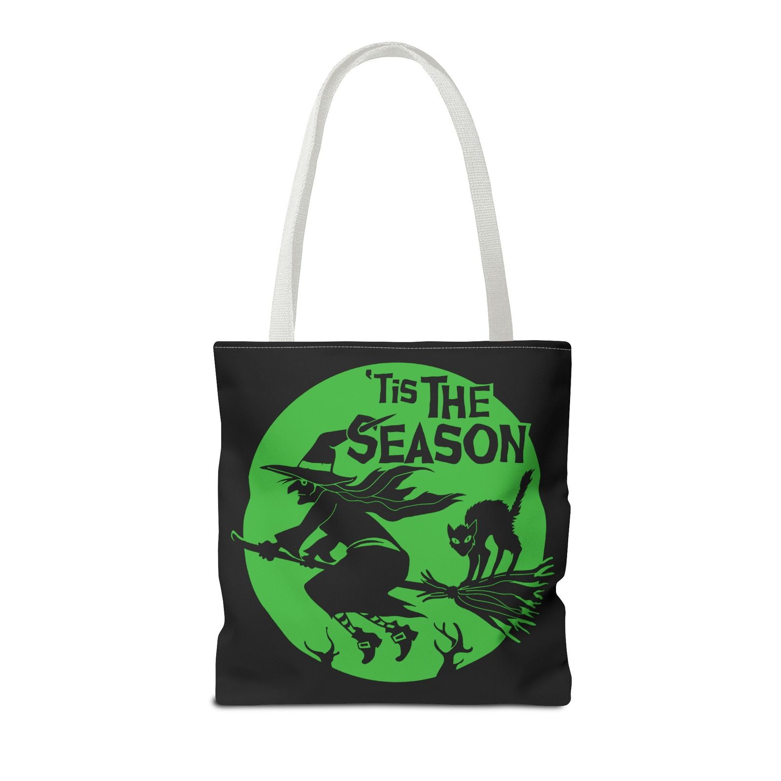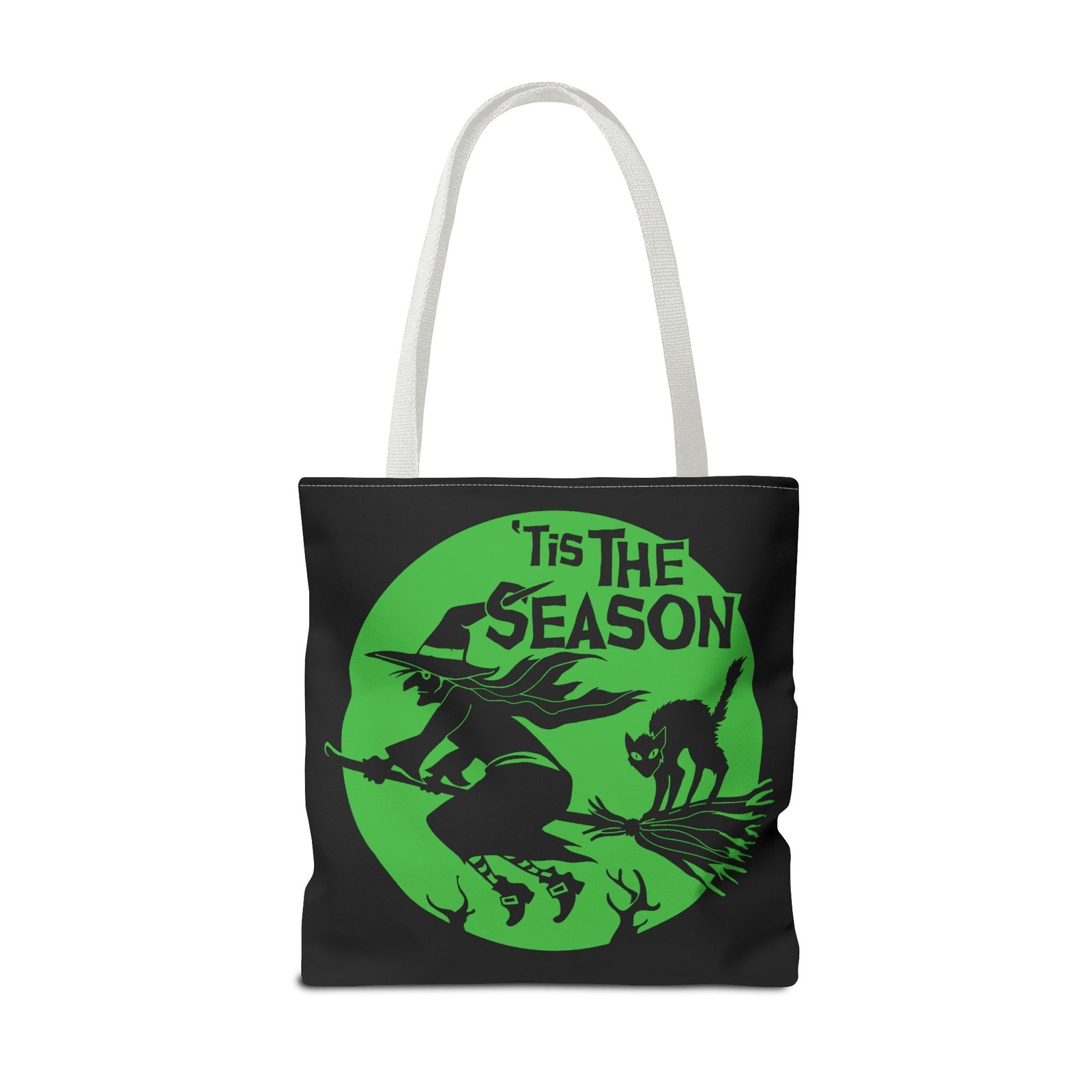 Celebrate the magic of Halloween with this enchanting tote bag featuring a classic witch soaring across the night sky on her broom, her loyal black cat perched beside her. Finished with the spellbinding phrase “’Tis The Season Of The Witch,” this design is a perfect mix of charm and mystery.