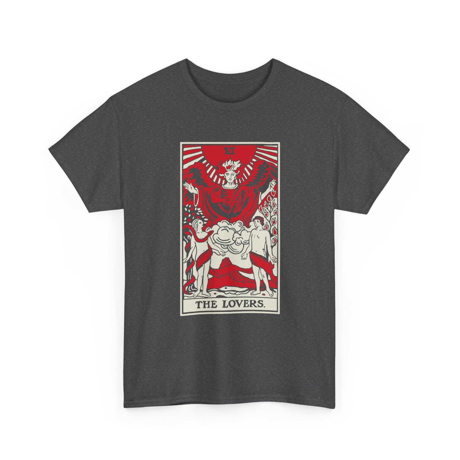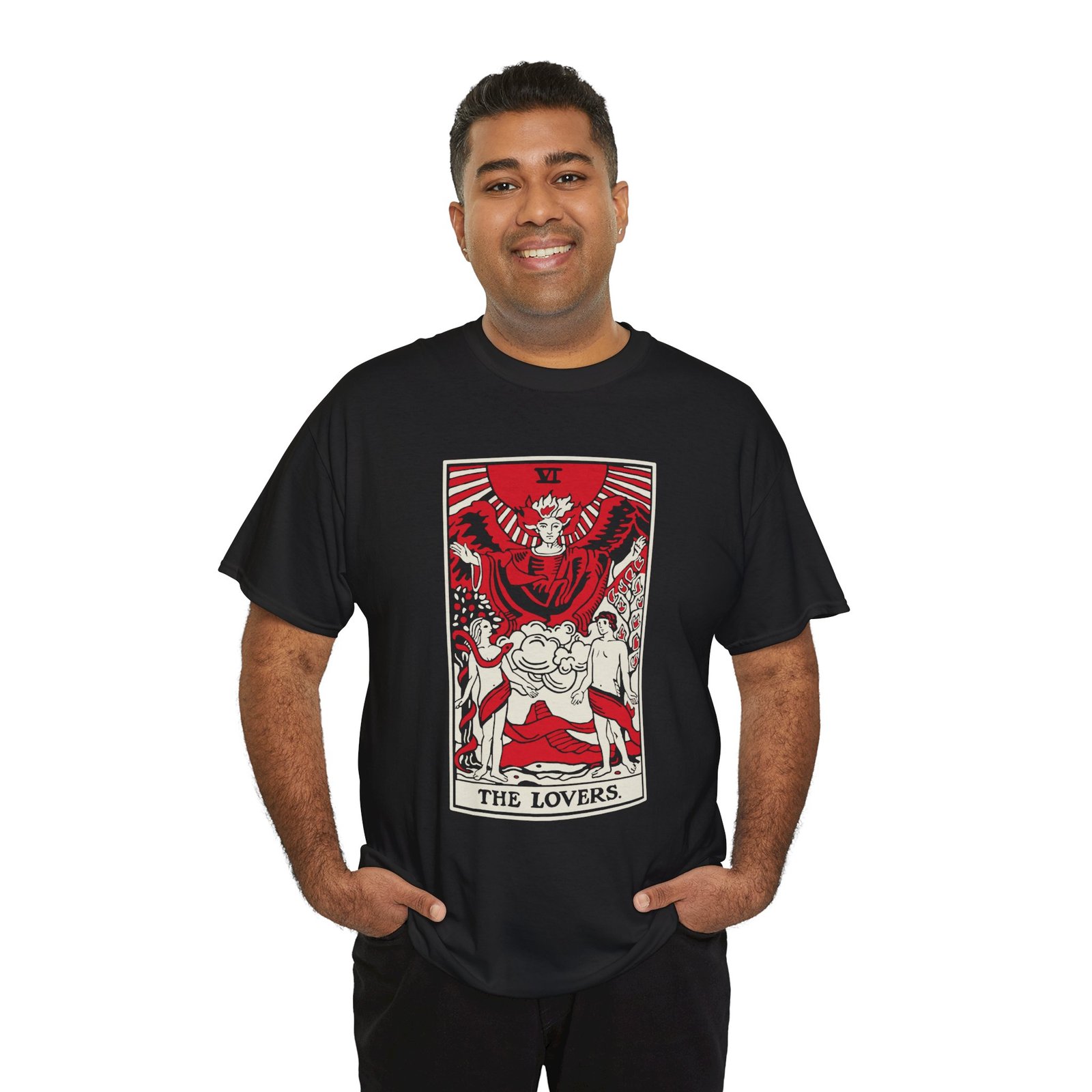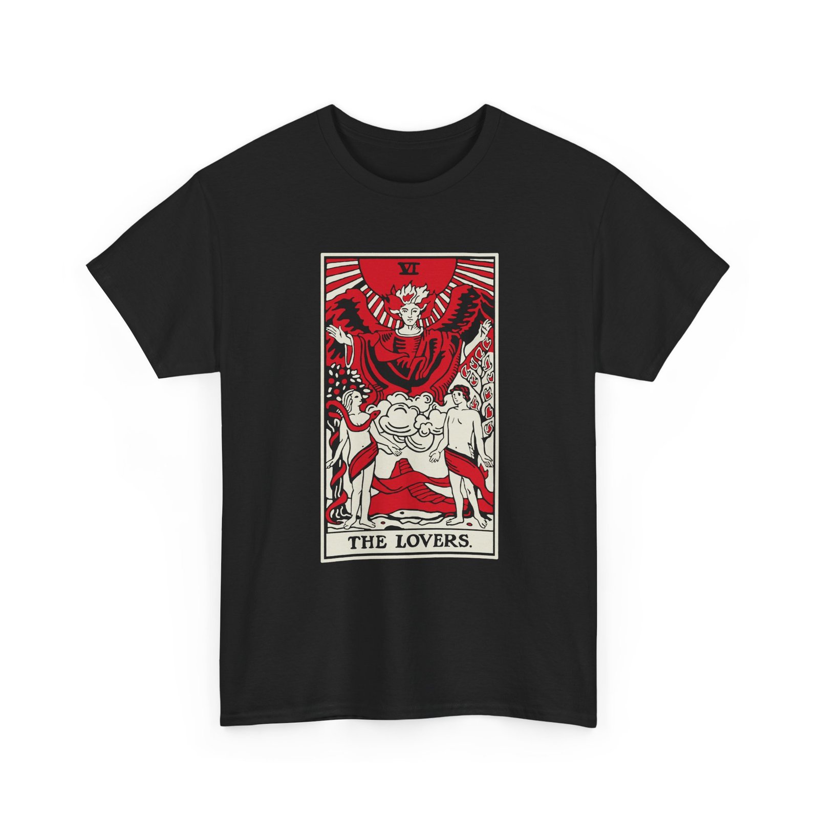 Keywords: Lovers tarot shirt, tarot card tee, unisex mystical t-shirt, spiritual apparel, major arcana shirt, celestial lovers shirt, occult fashion, witchy aesthetic, esoteric clothing, love and fate tee